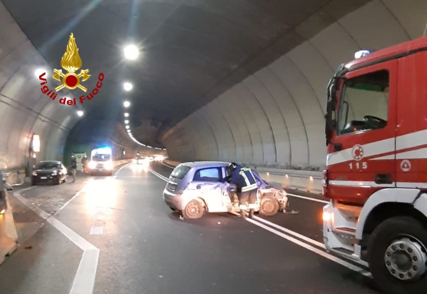 Un’auto, per cause ancora da accertare, ha sbandato ed è andata ad impattare sul cemento armato della galleria.
