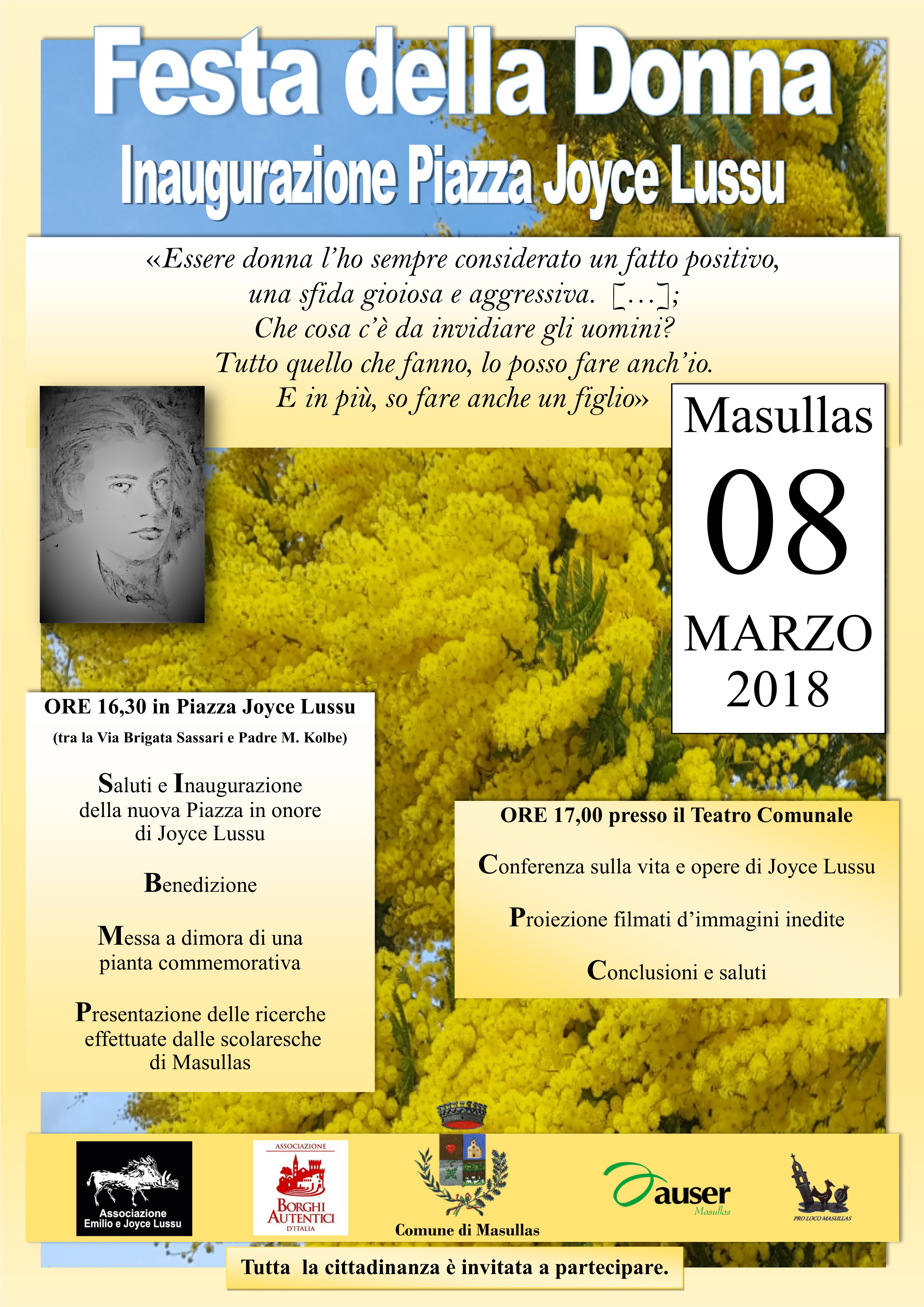 Nella Giornata Internazionale della Donna, Masullas decide di intitolare proprio a Joyce Salvadori Lussu una delle piazze del paese. Alle 16:30, verrà messa a dimora nella piazza una pianta commemorativa di ginepro. L’albero, che si piega sotto il maestrale della Sardegna ma non si spezza, è stato scelto come emblema della figura di una donna che per tutta la sua esistenza ha lottato contro le intemperie della vita senza spezzarsi.