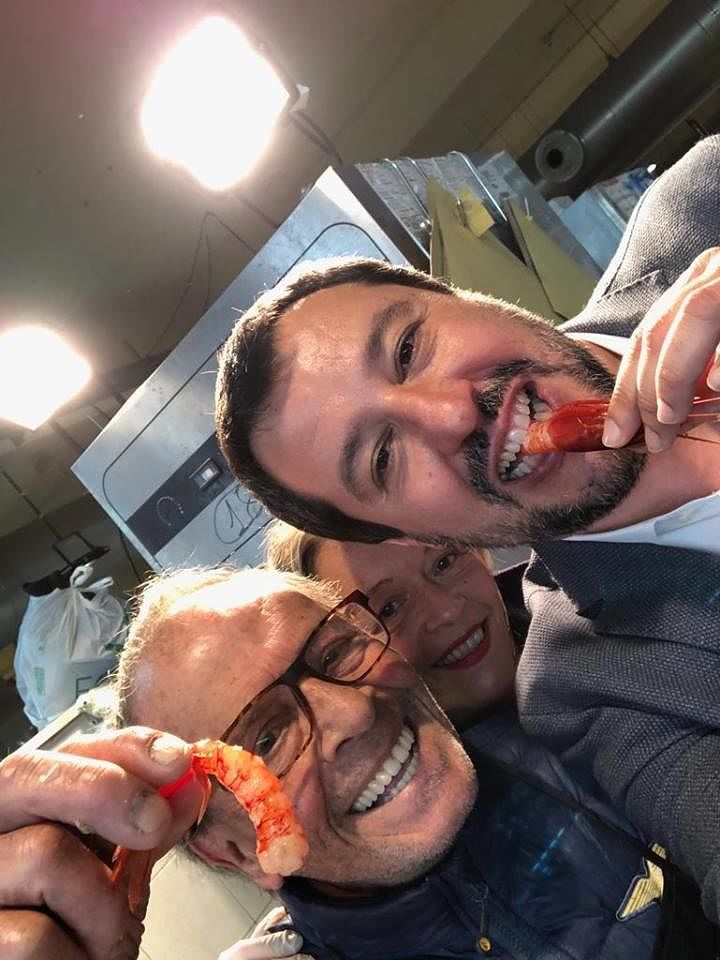 Dopo aver preso alcuni gamberi li ha offerti a Salvini, e lui li ha mangiati crudi. Poi, l’immancabile foto sul suo profilo ufficiale Facebook: “Al mercato di San Benedetto a Cagliari gamberi freschi, saporiti e soprattutto italiani! Che buoni”.