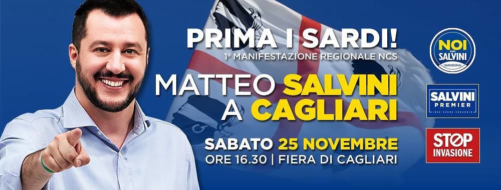 Matteo Salvini pronto a sbarcare a Cagliari al grido di “Stop invasione” e “Andiamo a governare”, ecco il suo annuncio di oggi: Amici Sardi, sabato prossimo, 25 novembre, alle 16.30 alla Fiera di CAGLIARI sono felice e orgoglioso di tornare nella vostra splendida isola. Vi aspetto in tantissimi!