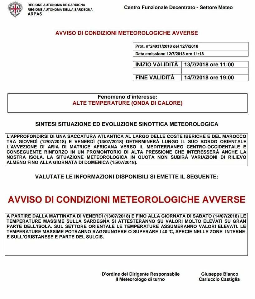La Protezione Civile ha diramato un avviso per condizioni metereologiche avverse per ALTE TEMPERATURE ( Onda di calore )dal 13/07/2018 ore 11 al14/07/2018 alle 19.
