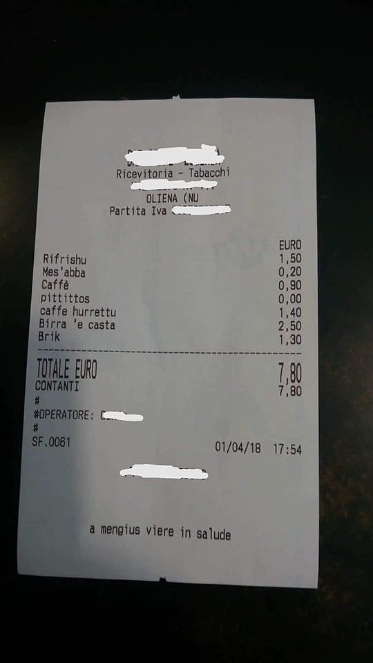 Lo scontrino? C’è chi lo “batte” in sardo. Succede a Oliena, in quella profonda Sardegna dove le “tradizioni grammaticali” sono, fortunatamente, dure a scomparire. Le parole “caffè” e “birra” sono le uniche scritte in italiano, il resto dei prodotti consumati sono rigorosamente in sardo. “Rifrischu” 1 euro e 50, “mes’abba” cioè mezzo bicchiere d’acqua 20 centesimi, il caffè “hurrettu” a un euro e quaranta e su “brik” a 1 euro e trenta. Lo scontrino, pubblicato su Facebook, diventa virale.