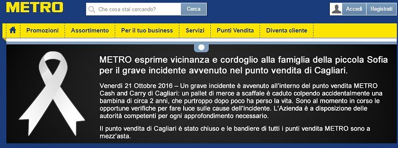 METRO esprime vicinanza e cordoglio alla famiglia della piccola Sofia per il grave incidente avvenuto nel punto vendita di Cagliari. Si legge cosi, con un’immagine a lutto, sulla home page del sito del gruppo Metro.