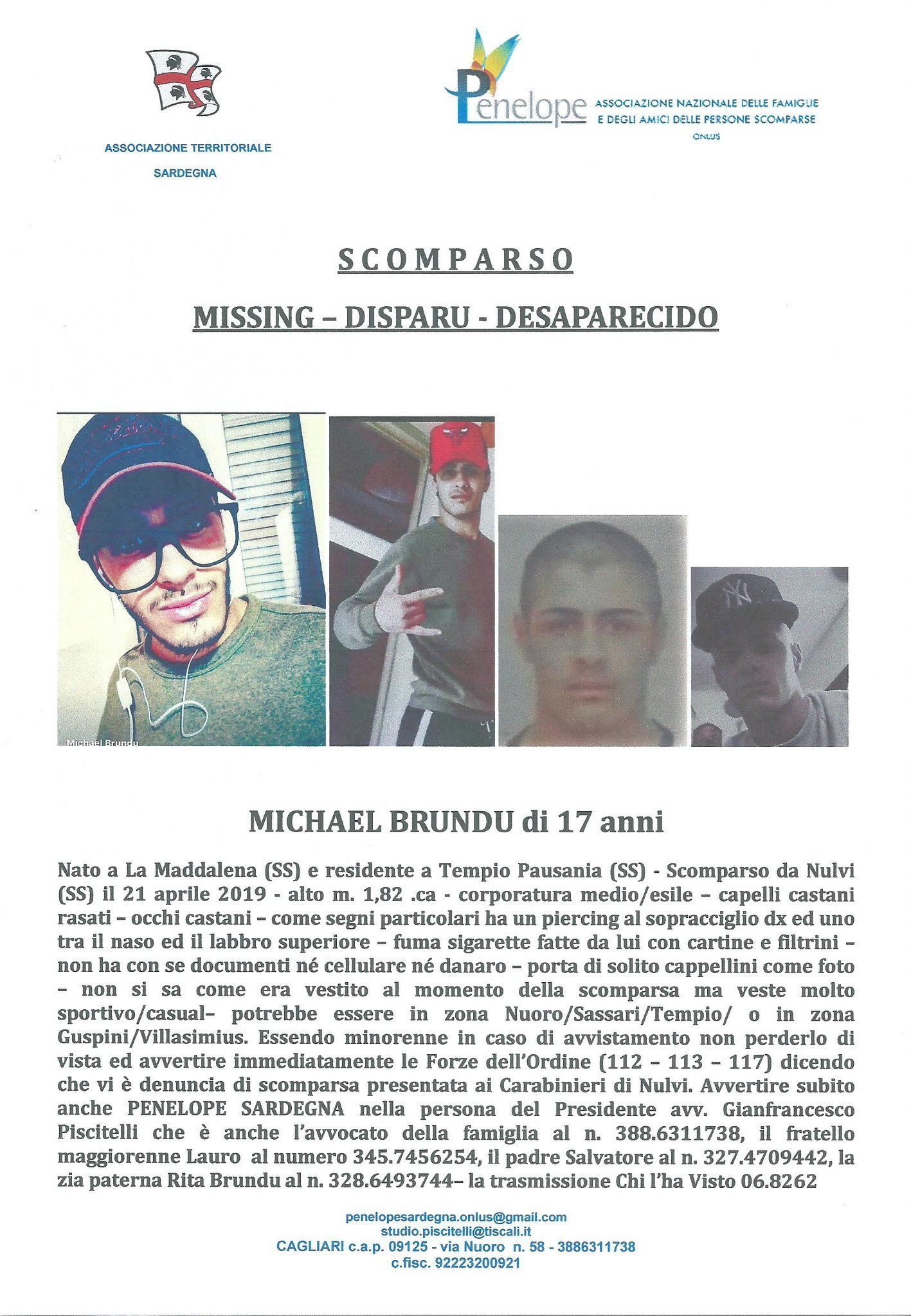 Del giovanissimo Michael Brundu non si hanno più notizie dal 21 aprile. A lanciare l’appello è l’avvocato della famiglia Gianfranco Piscitelli: “Trattasi di minorenne…. se qualcuno gli da ospitalità o lo nasconde commette un reato perseguibile penalmente. Michael, se leggi o ti fanno leggere questo messaggio mettiti in contatto quantomeno con tuo fratello Lauro o se preferisci anche con me nella massima discrezione. Non fare stare in pena chi ti vuole bene. Se qualcuno ha notizie o sa indicarci come rintracciarlo può contattarmi anche anonimamente, a qualsiasi ora giorno e notte al 388.6311738.”