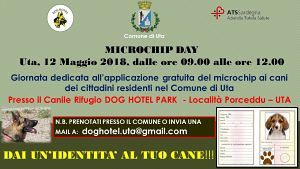 Microchip day presto a Uta. In collaborazione con il Comune e l’ATS Sardegna, il canile Dog hotel Park ha organizzato per il prossimo 12 maggio una giornata dedicata alla chippatura gratuita dei cani di proprietà. E’ aperta a tutti, in particolare ai residenti di Uta. Per partecipare è indispensabile compilare il modulo scaricabile dal sito www.doghotel.it, in alternativa ci si può iscrivere recandosi all’ufficio Protocollo del Comune di Uta.