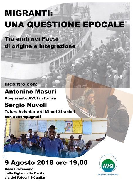 “Migranti: una questione epocale. Tra aiuti nei Paesi di origine e integrazione”: è il titolo dell’incontro organizzato da AVSI Point Cagliari che si terrà giovedì 9 agosto alle 19 nei locali della Casa Provinciale delle Figlie della Carità, in via dei Falconi a Cagliari.