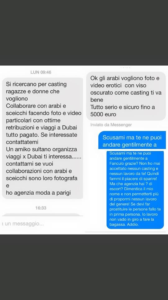 L’incredibile messaggio-trappola arriva su Messanger a una ragazza cagliaritana, professione modella, che vive e lavora a Milano. “Si ricercano per casting donne e ragazzi disposte a collaborare con arabi e sceicchi”. Sembrerebbe una buona occasione, anche se qualcosa stona subito. “Foto e video particolari con viaggi pagati a Dubai, e ottime retribuzioni”. Qualcosa non va, eppure l’interlocutrice non si scompone. “Contattami se vuoi, sono una loro fotografa e ho un’agenzia di moda a Parigi”. Ah sì, e poi? “Ok gli arabi vogliono foto e video erotici, con viso oscurato, pagamento sino a 5000 euro. Ti va bene?”, e a quel punto si tratta di un adescamento vero e proprio. Tanto che la giovane modella cagliaritana giustamente risponde per le rime. E commenta: “Le agenzie “serie”.. Ragazze attenzione ad accettare qualsiasi lavoro su internet!! La maggior parte cercano solo ragazze osè disposte a fare qualsiasi cosa per un po di soldini! SCHIFO!”. Un monito per tutte le giovani ragazze: occhio alle finte proposte di lavoro che in realtà riservano ben altre, poco gradite, sorprese. Nella foto, l’incredibile messaggio su Whatsapp.