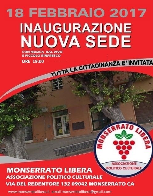 Sabato 18 Febbraio alle ore 19, verrà inaugurata la nuova sede del Movimento Politico Culturale “Monserrato Libera”, in via del Redentore 132 a Monserrato. Movimento/Associazione Politico Culturale, di cui è Presidente il Sindaco Tomaso Antonio Locci, espressione della lista denominata appunto Monserrato Libera.