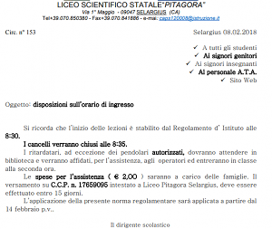 Si legge nella circolare numero 153 a firma del dirigente scolastico Salvatore Angius: “I cancelli verranno chiusi alle 8:35. I ritardatari, ad eccezione dei pendolari autorizzati, dovranno attendere in biblioteca e verranno affidati, per l’assistenza, agli operatori ed entreranno in classe alla seconda ora. Le spese per l’assistenza ( € 2,OO ) saranno a carico delle famiglie”.