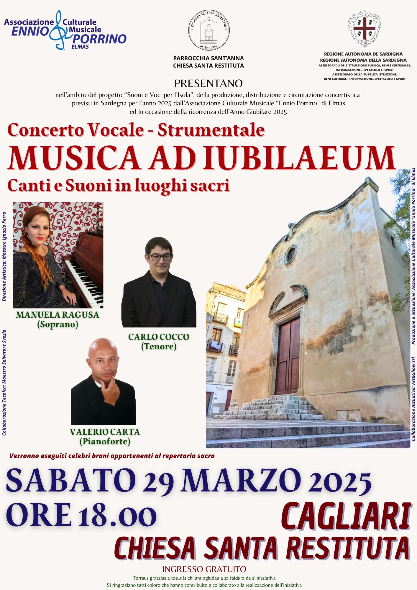 L’Associazione Culturale Musicale “Ennio Porrino” di Elmas presenta la nuova produzione concertistica “Musica ad Iubilaeum – Canti e Suoni in luoghi Sacri” che si terrà sabato 29 marzo 2025 alle ore 18.00 a Cagliari, nella suggestiva cornice della Chiesa di Santa Restituta, grazie anche alla collaborazione della Parrocchia Sant’Anna e del parroco della Chiesa di Santa Restituta, Don Markhevka Bogdan. L’evento si inserisce nell’ambito del progetto “Suoni e voci per l’isola” e rientra nel vasto programma di attività di produzione, circuitazione e distribuzione di spettacoli e iniziative artistico-culturali-musicali che l’Associazione sta realizzando in Sardegna nel corso del 2025 con la direzione artistica del Maestro Ignazio Perra.