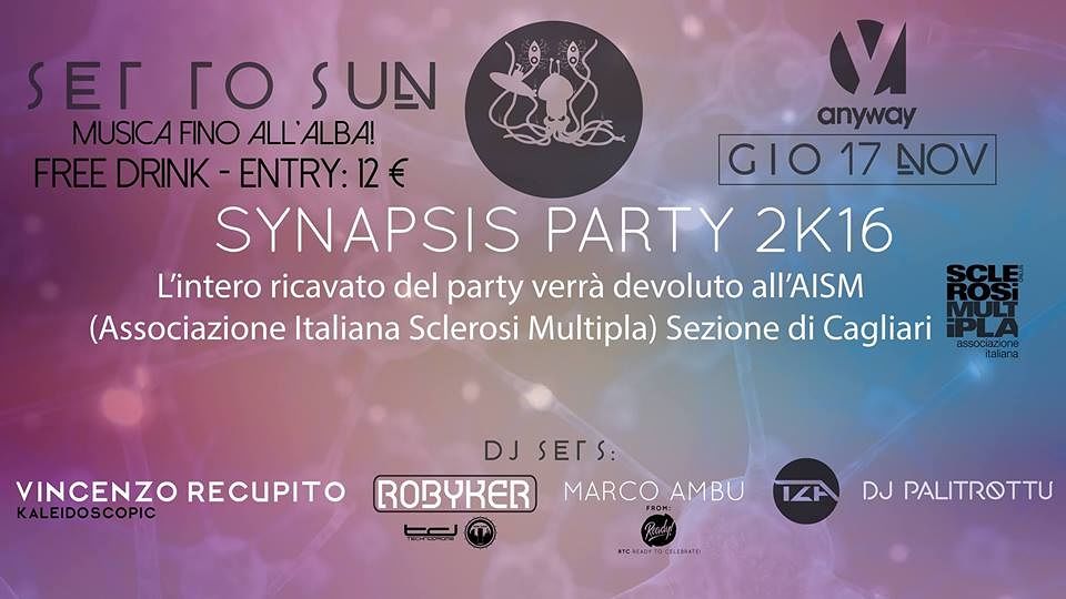 Una serata dove protagoniste saranno la musica e soprattutto la solidarietà. “Set to Sun -Synapsis Party” è l’evento organizzato dall’associazione Quiescenza (autrice da svariati anni del “Set To Sun Music Festival”) e da numerosi volontari, che si terrà il 17 novembre 2016 a Cagliari presso il circolo Anyway in via Cesare Battisti con l’intento di raccogliere fondi per l’AISM (Associazione Italiana Sclerosi Multipla) di Cagliari.