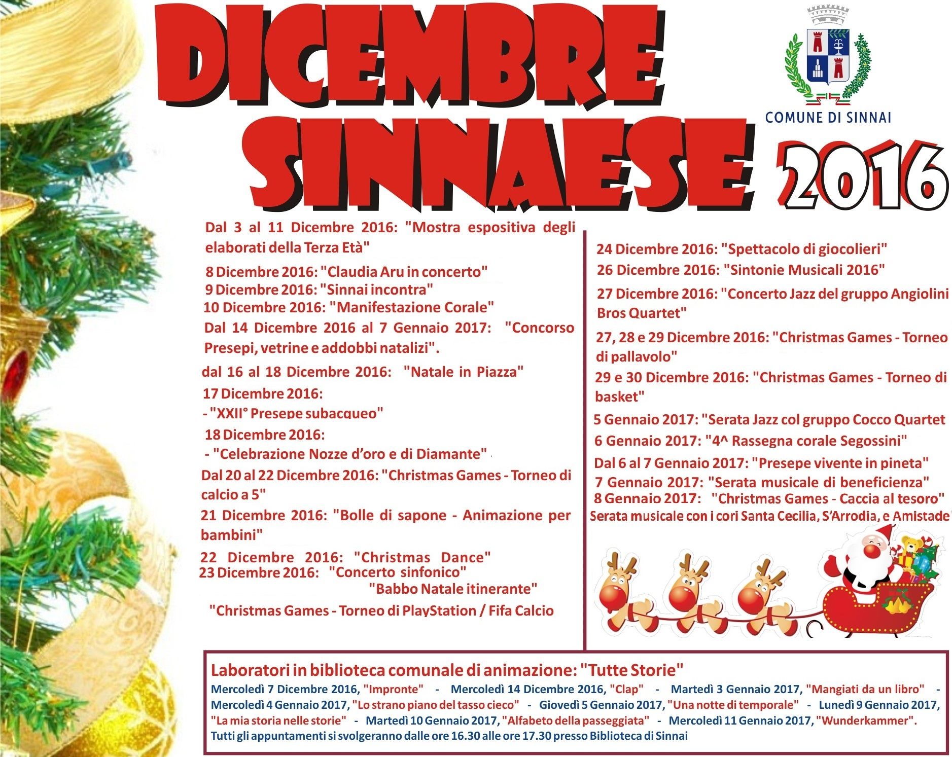 23 Dicembre 2016: – “Concerto sinfonico” – A cura degli allievi della Scuola Civica di Musica – Presso Aula Consiliare – Ore 20.00 – “Babbo Natale itinerante” – A cura della Pro Loco Sinnai – Per le vie del paese e mercato di Sinnai – “Christmas Games – Torneo di PlayStation / Fifa Calcio ” – A cura della Pro Loco Sinnai – Presso Biblioteca Sinnai – Dalle ore 10.00 alle ore 20.30