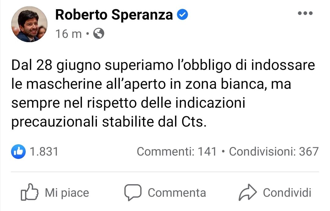 “Dal 28 giugno superiamo l’obbligo di indossare le mascherine all’aperto in zona bianca, ma sempre nel rispetto delle indicazioni precauzionali stabilite dal Cts”. A comunicarlo è il ministro della Salute Roberto Speranza, che recepisce le indicazioni del Cts e anticipa di qualche giorno, rispetto alla data del 5 luglio, la fine dell’obbligo si coprirsi naso e bocca negli spazi aperti. Un provvedimento che, da quella data, riguarderà tutte le regioni italiane, Sardegna compresa, che ha anche il beneficio ulteriore della zona verde europea.