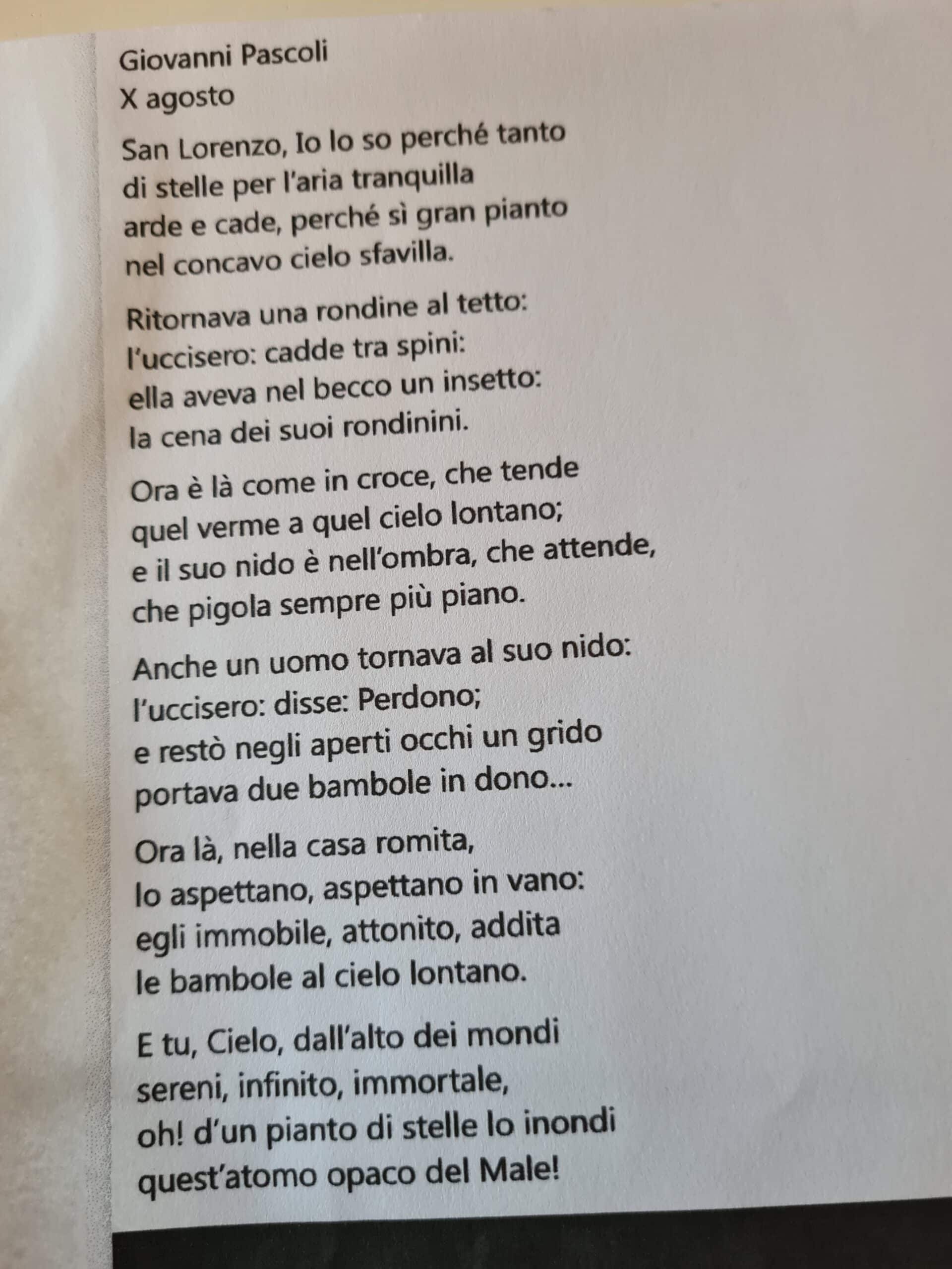 ben dieci figli, dei quali Giovanni era il quarto, che aveva appena 12 anni. Dopo 29 anni , Giovanni scrisse ” X AGOSTO”, resa pubblica per la prima volta il 10 agosto del 1896. Da allora, da 129 anni la troviamo nei testi scolastici di ogni grado e di molti Paesi nel Mondo, oggetto di studio e di riflessione per il ricordo appunto, per lo spirito di vicinanza, per la speranza che diffonde, per i sentimenti di amore e bontà che stimola nei giovani e negli adulti, nelle donne e negli uomini là dove stasera siamo con gli occhi all’insù per cercare e vedere le ” stelle cadenti” nella volta celeste.Anche io lo farò, dai balconi della mia casa che prospettano sia ad oriente, con la vista del Castello e della cupola della Cattedrale, che ad occidente, sul mare di Giorgino e i monti di Capoterra.