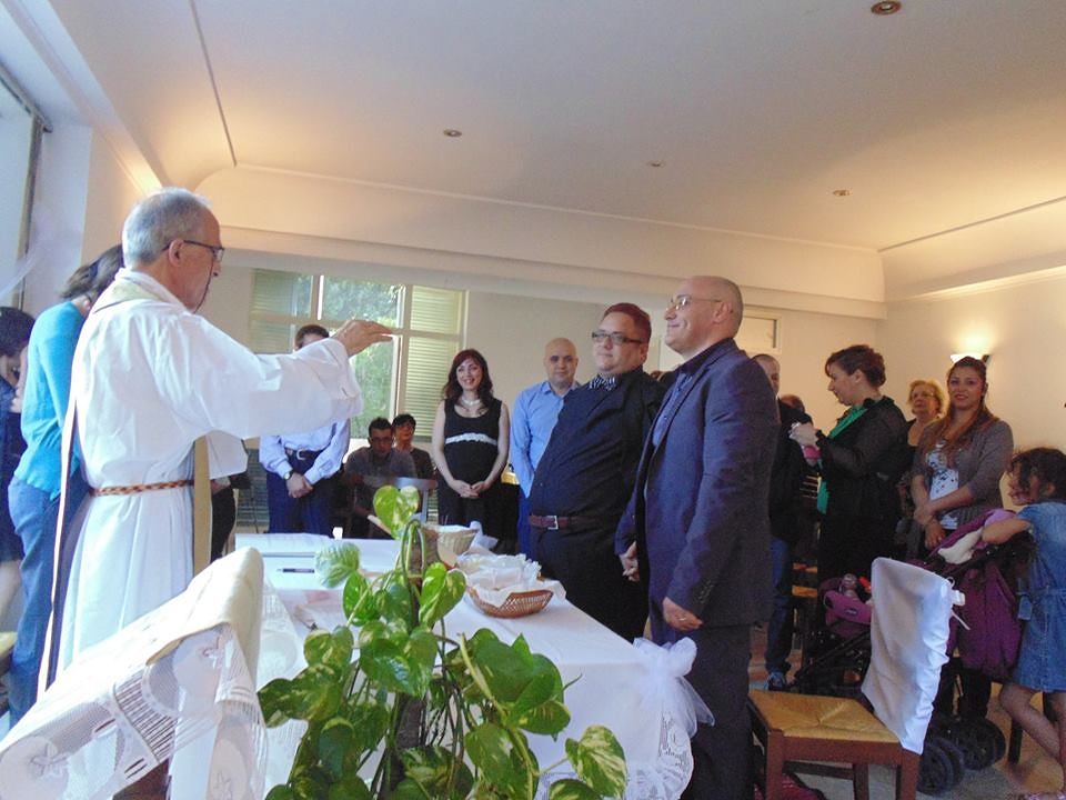 Anche se in realtà come spiega il neo sposo Damiano “la nostra unione è valida solo a fini ecclesiastici e non civili, e si chiama “benedizione di coppia”. Io e Sergio siamo fidanzati da sei anni, è da tanto tempo che volevamo fare questo passo, qualcosa che ci unisse definitivamente, anche se la legge italiana non ce lo permette. Nonostante ciò avevo letto su internet che la chiesa evangelica officiava questi tipo di benedizione, così ci siamo messi in contatto con la pastora Cristina Arcidiacono. Con lei abbiamo avuto un colloquio, e dopo di che la pastora ha chiesto al consiglio di chiesa se poteva officiare la nostra unione. La risposta è stata positiva, quindi abbiamo iniziato il corso e Don Tonino Cao ha benedetto la nostra unione. Siamo felici di avere fatto almeno questo primo passo, anche se, purtroppo, non è valido civilmente”.