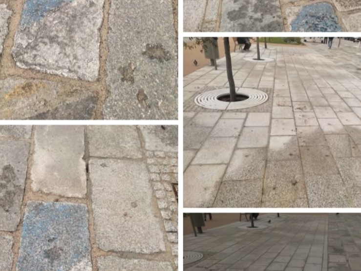 Le foto che allego riproducono parti segnate in blu o in bianco posizionate alla meglio. A fianco un nuovo granito dozzinale, manco fosse terminato il basolato originario, cui segue un meraviglioso tartan, in perfetto stile sovietico, immagino per agevolare l’attività fisica degli atleti del futuro”.