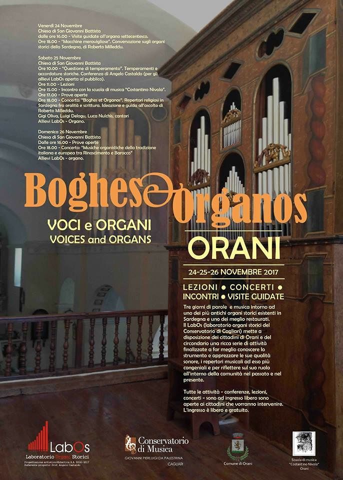 Sabato 25 novembre, si comincia alle 10 con una conferenza sui temperamenti e le accordature storiche tenuta da Angelo Castaldo, docente di Organo nel Conservatorio di Cagliari. La mattinata proseguirà con delle lezioni rivolte a un gruppo di studenti del Conservatorio, mentre alle 15 è in programma un incontro con la Scuola civica di musica “Costantino Nivola”. La giornata si conclude alle 18 con un concerto dal titolo “Boghes et organos, repertori religiosi in Sardegna fra oralità e scrittura”: l’appuntamento sarà accompagnato da una guida all’ascolto curata da Roberto Milleddu.