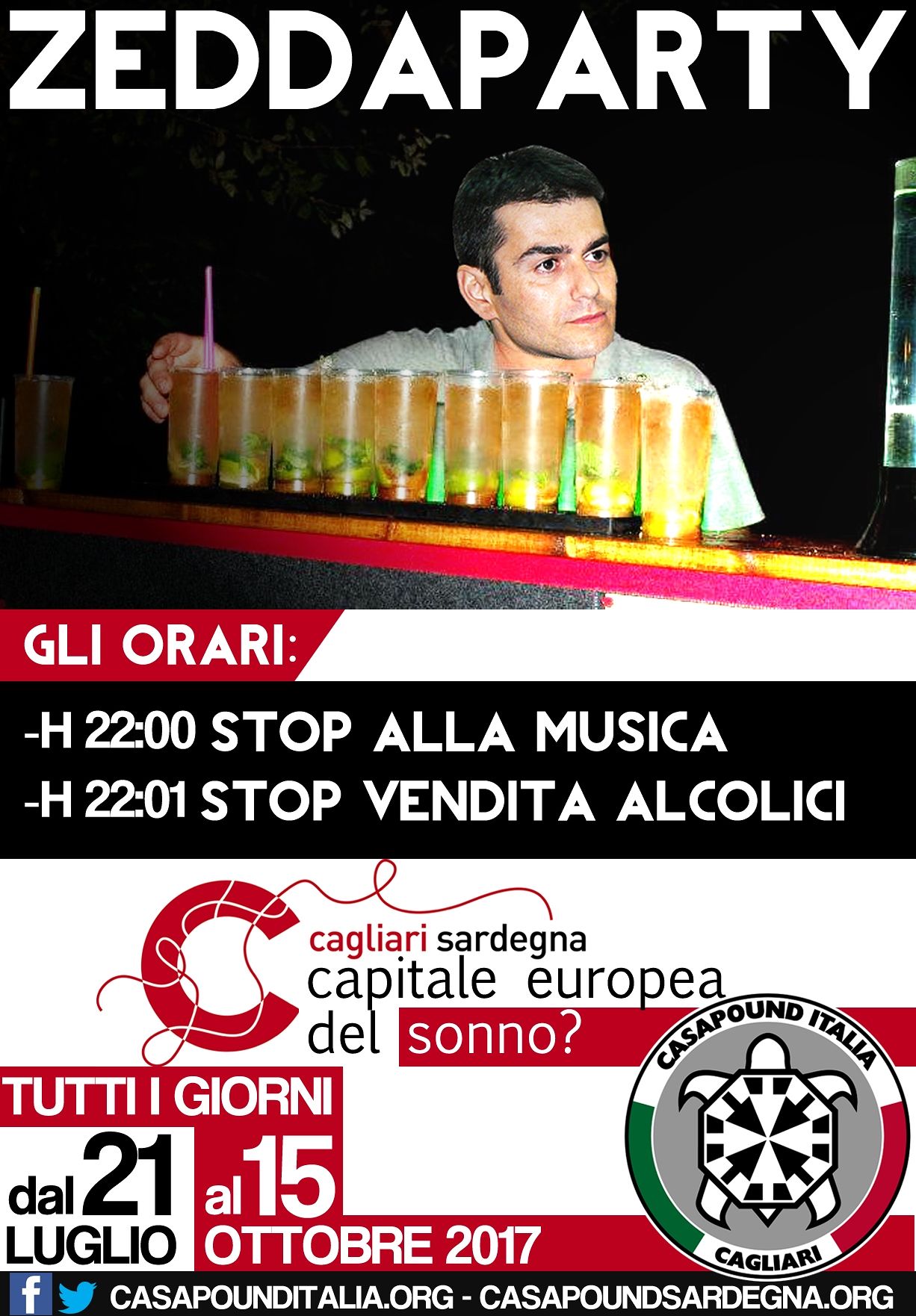 “Al sindaco facciamo notare che non è a causa della musica o di qualche birra venduta oltre le 22:00 che oggi il centro storico presenta igiene, decoro e sicurezza a dir poco carenti” – prosegue CPI – “le cause principali del degrado, che secondo le intenzioni di Zedda verrebbe limitato da questa ordinanza, non sono certo i pochi bar rimasti aperti in piazza del Carmine o Matteotti in seconda serata. Bisognerebbe essere del tutto ciechi per non individuarle, invece, nelle bancarelle abusive, nelle minacce ricevute da chi parcheggia o nelle violente risse di cui sono protagoniste decine di clandestini: vere e proprie zone off-limit se a presidiarle non è presente una camionetta della polizia”.