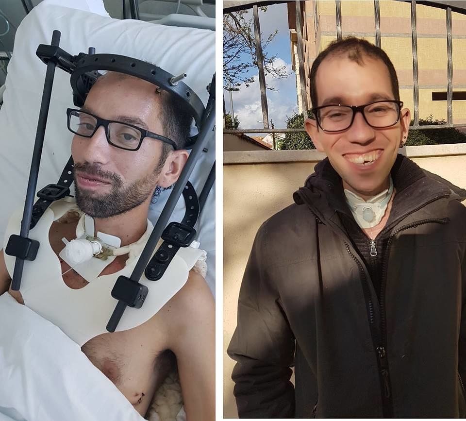 Da allora vive la sua vita a metà. “Ho avuto la frattura di due vertebre principali la c2 e la c1, trachea tranciata, polmoni collassati,trauma cranico e frattura cranica” – racconta-.Sono stato operato circa 5 volte in soli 3 giorni e successivamente tracheotomizzato (a vita), sedativi, sondino naso gastrico etc.. insomma sono rimasto in coma per un mese”.