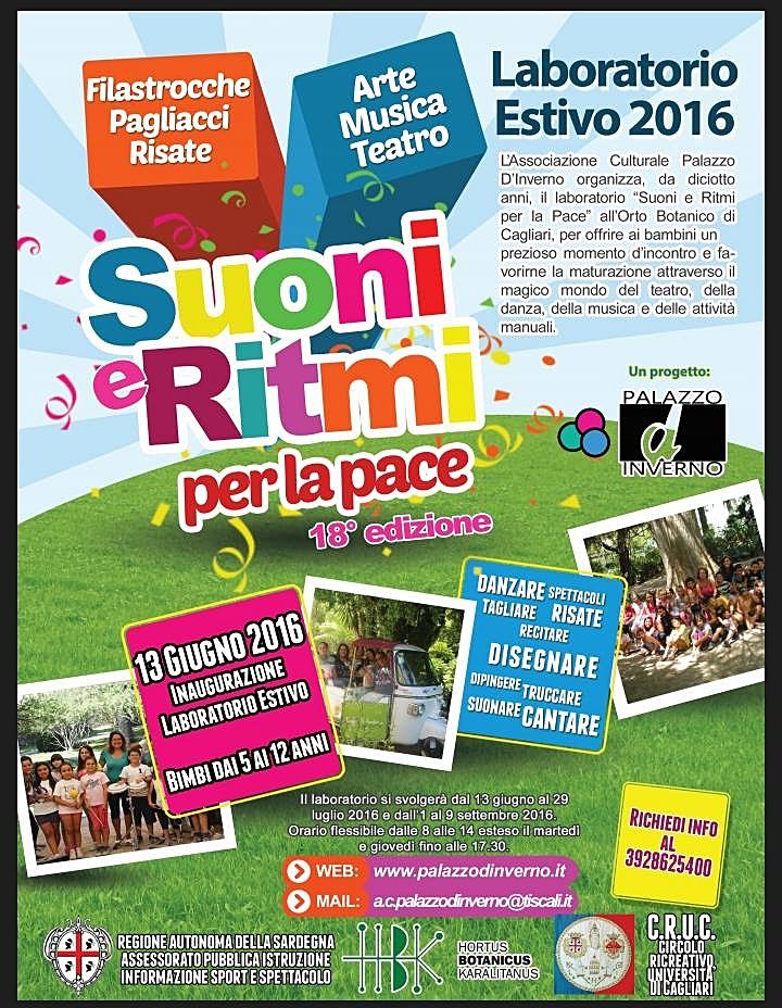 L’Associazione culturale “Palazzo D’Inverno” propone la 18° edizione del laboratorio “Suoni e Ritmi per la Pace”, destinato ai bambini dai 5 agli 12 anni. Il laboratorio si svolgerà come sempre all’Orto Botanico di Cagliari, dal 13 giugno al 29 luglio e dall’ 1 al 9 settembre 2016, dal lunedì al venerdì dalle ore 08,00 alle ore 14,00 e il martedì e il giovedì fino alle ore 17,30.