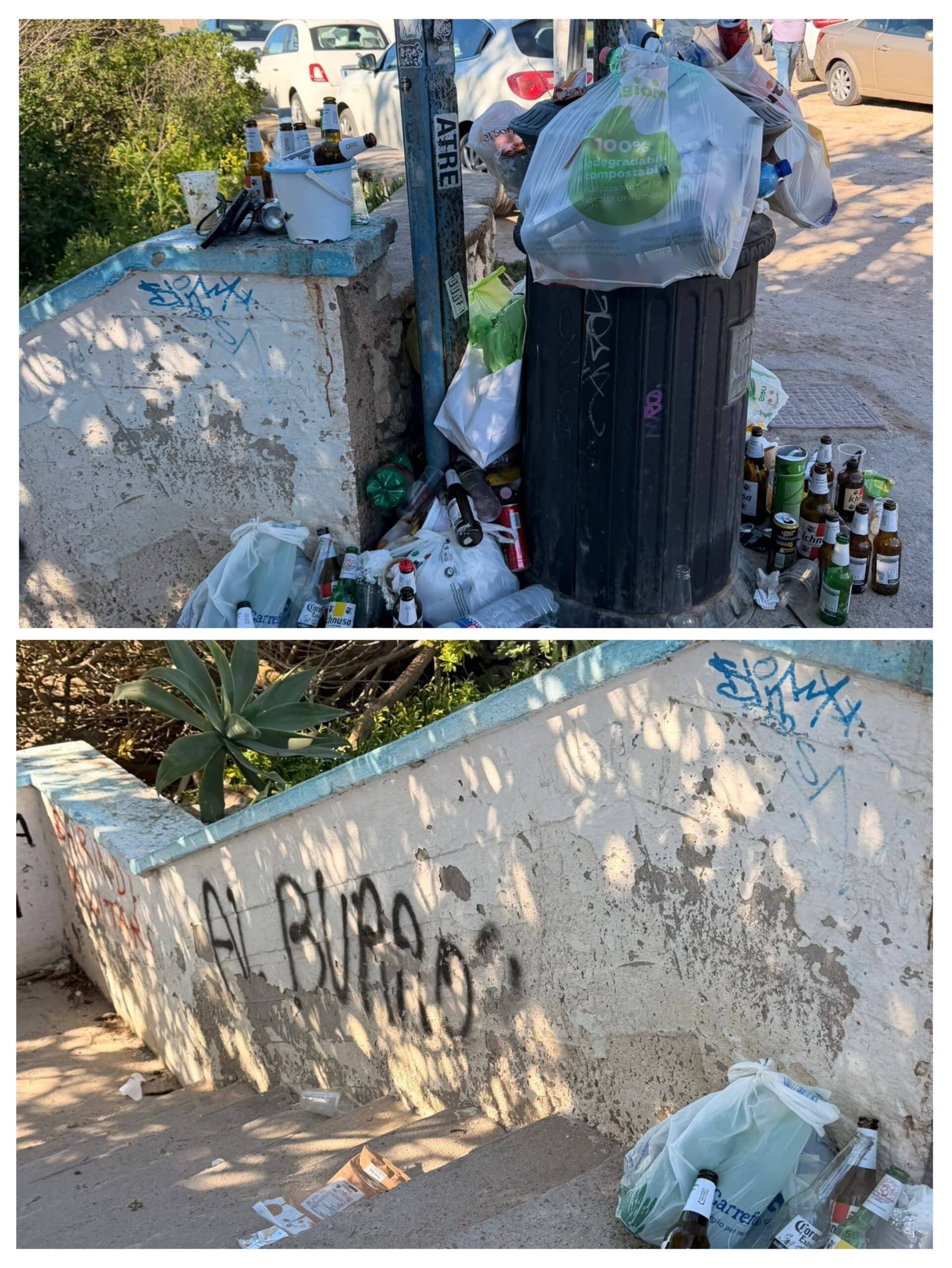 Le scalette che conducono alla spiaggia sono state trasformate in una sorta di discarica temporanea: cumuli di bottiglie di birra vuote, buste di plastica cariche di rifiuti e cartacce sparse su ogni gradino, rendendo persino difficoltoso il passaggio.