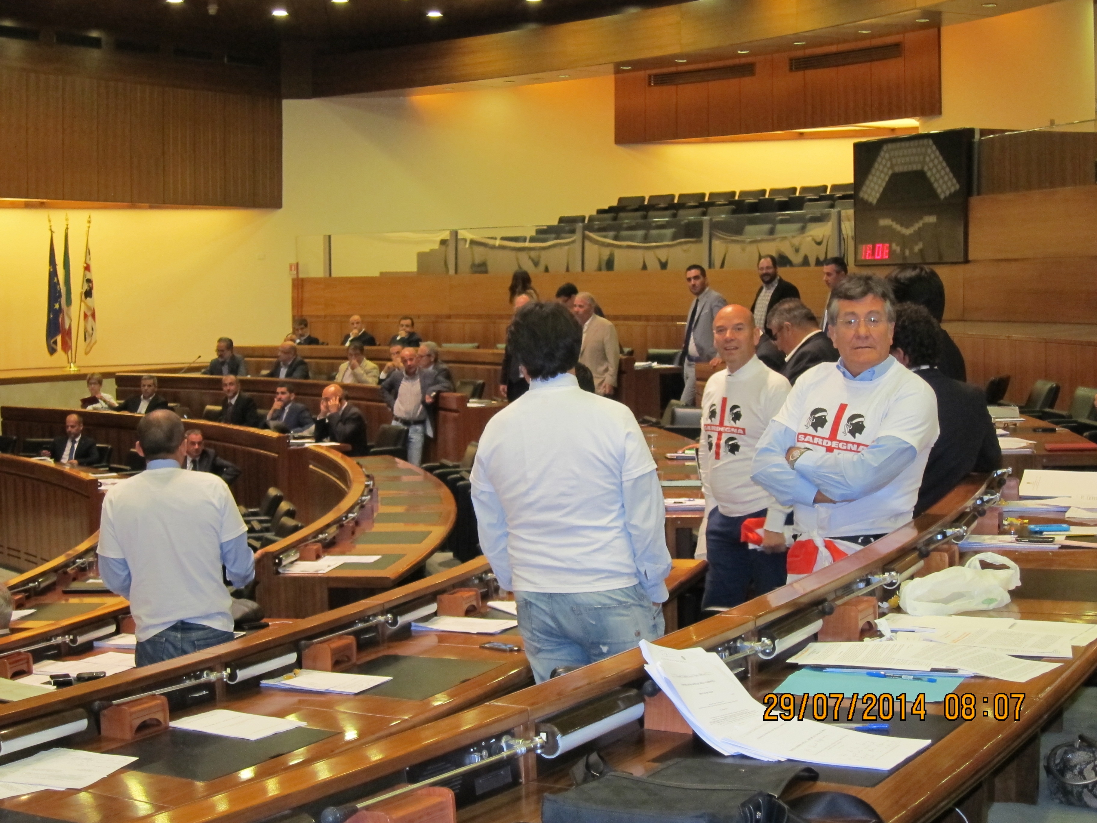 Magliette e bandiere dei Quattro mori e seduta sospesa: il presidente dell’assemblea regionale, Gianfranco Ganau, convoca la conferenza dei capigruppo, e il centrodestra dopo aver occupato i banchi della Giunta chiede il rinvio della discussione in Consiglio a domani. La protesta riguarda l’intesa tra Stato e Regione per il pareggio di bilancio nel 2015 e per l’allargamento dei vincoli del patto di stabilità per il 2014 pari a 364 milioni di euro.