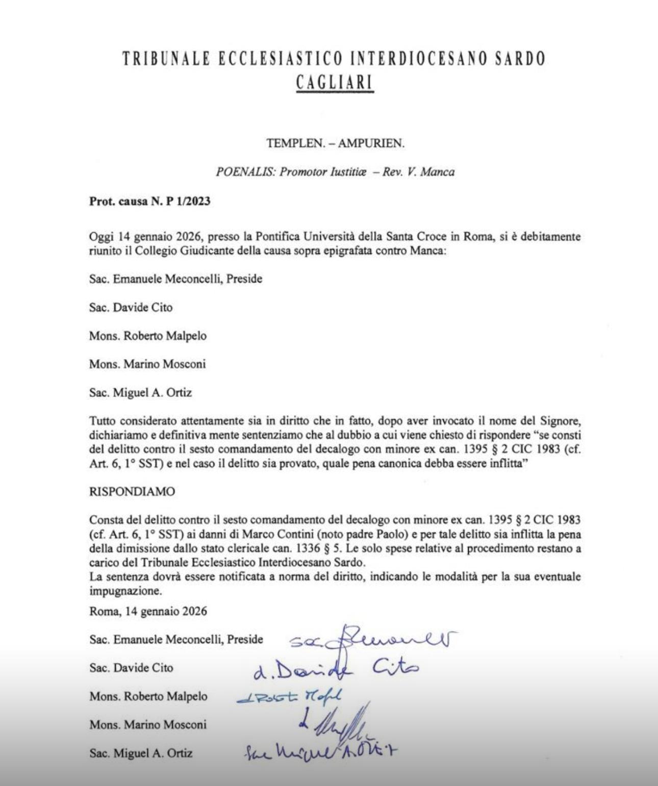 “Sono state riconosciute vere le denunce e gli abusi. Il prete della diocesi di Tempio-Ampurias don Valerio Manca (da frate noto padre Emanuele) è stato dimesso dallo stato clericale, cioè non è più sacerdote della Chiesa cattolica”. Lo annuncia sui social padre Paolo Contini, una delle vittime che aveva denunciato l’ormai ex sacerdote: il tribunale ecclesiastico interdiocesano della Sardegna ha dimesso dallo stato presbiteriale il prete che a cavallo della fine degli anni Ottanta diresse il Collegio serafico francescano di Oristano. Il collegio giudicante, riunito nella Pontificia università Santa Croce a Roma, ha accolto le tesi dell’accusa che aveva chiesto la pena massima, ovvero la perdita dei voti e la cacciata da qualsiasi ordine ecclesiastico. A scoperchiare la serie di abusi sessuali all’interno del collegio era stato proprio padre Paolo Contini che, il 13 maggio 2023, denunciò direttamente ai suoi parrocchiani gli abusi, portando poi la vicenda in tribunale ecclesiastico.