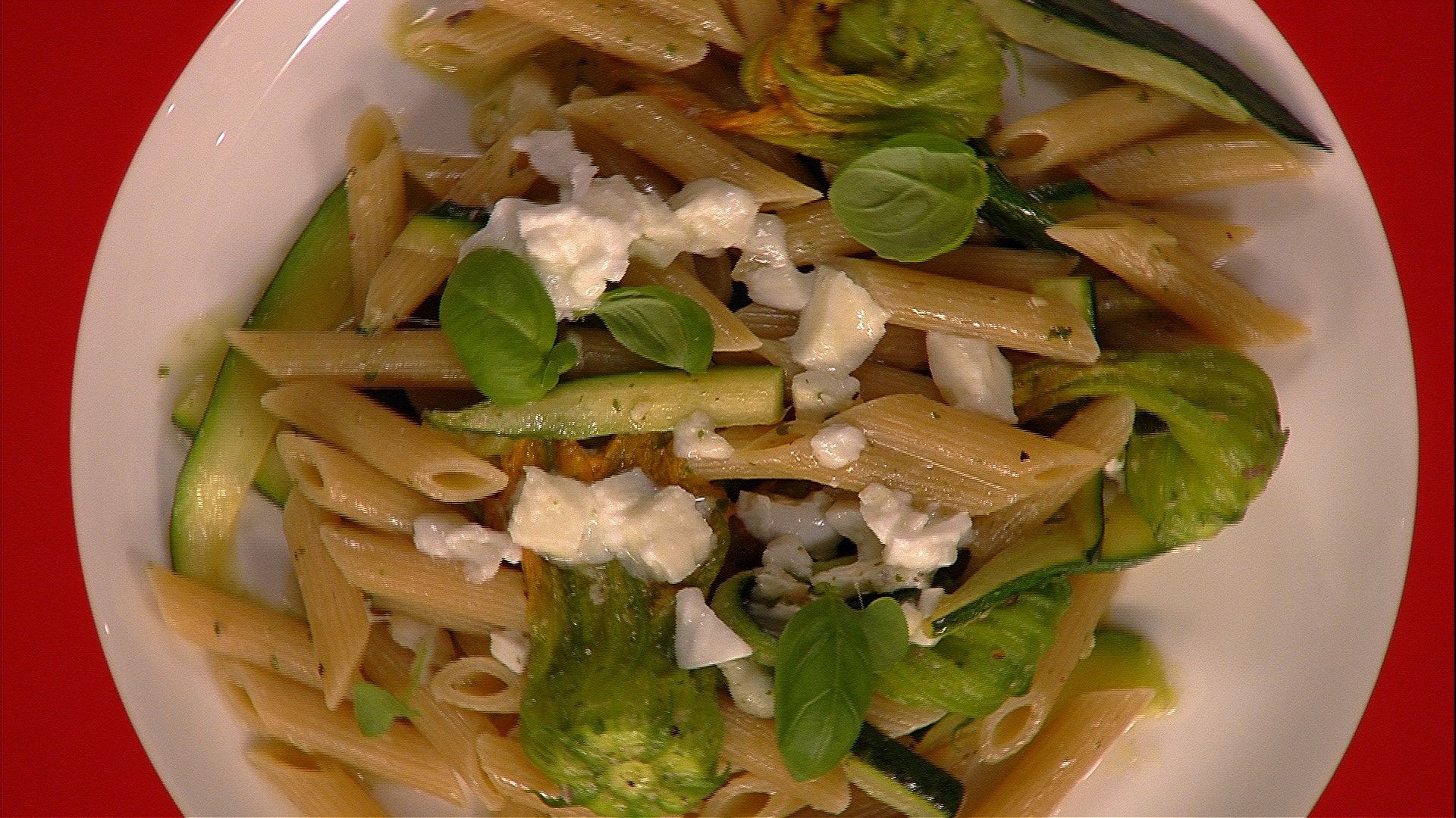 PENNE ALLE ACCIUGHE E MOZZARELLA 446 kcal 19,44 P 63,52 G 14,48 L A PORZIONE mezze penne 80 g acciughe sott’olio 10 g 50 g zucchine 1 fiori di zucca , basilico qb olio extra verine d’oliva 5 g parmigiano 10 g mozzarella fresca 30 g Preparazione Lavare le acciughe e tagliarle a pezzetti. Affettare le zucchine e saltarle in padella con i fiori. Tagliare la mozzarella a dadini. Cuocere la pasta e scolarla al dente, quindi condirla con la salsa di acciughe, i fiori di zucca e i dadini di mozzarella. Mescolare, profumare con qualche foglia di basilico e un tocco di parmigiano. (a cura di www.menutrix.it)