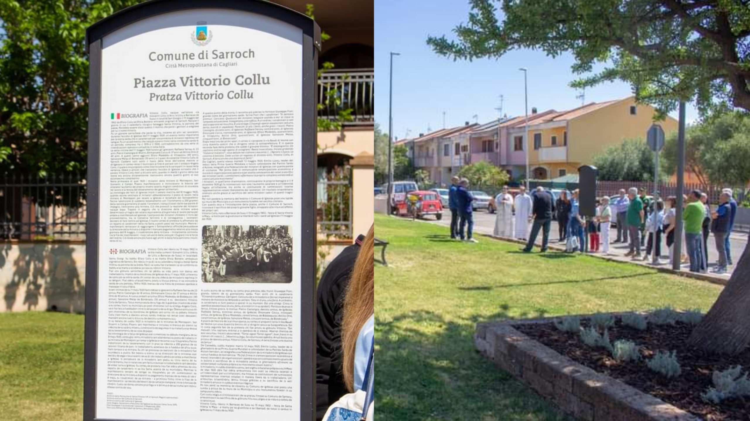 “Un giovane minatore sarrochese di Barracas de Susu che nel maggio 1920 perse la vita a Iglesias, durante una protesta repressa nel sangue, in cui i minatori chiedevano un aumento del proprio salario e migliori condizioni di sicurezza” ricorda il Comune. L’evento drammatico, che prende il nome di eccidio di Iglesias, viene ricordato insieme alla biografia di Vittorio Collu nella targa che è stata affissa nella piazza. “Dopo 104 anni – afferma Luca Tolu, Assessore alle Politche Ambientali – Sarroch rende onore alla memoria di Vittorio Collu. Questa Piazza ricorderà ai sarrochesi di oggi e di domani che, dietro alle libertà e diritti che oggi diamo per scontati, ci sono stati giovani che hanno lottato. Uno di questi era un figlio del nostro paese. Come Amministrazione, vogliamo ringraziare chi in questi anni si è speso affinché il ricordo di Vittorio Collu rimanesse impresso nella memoria dei sarrochesi.”