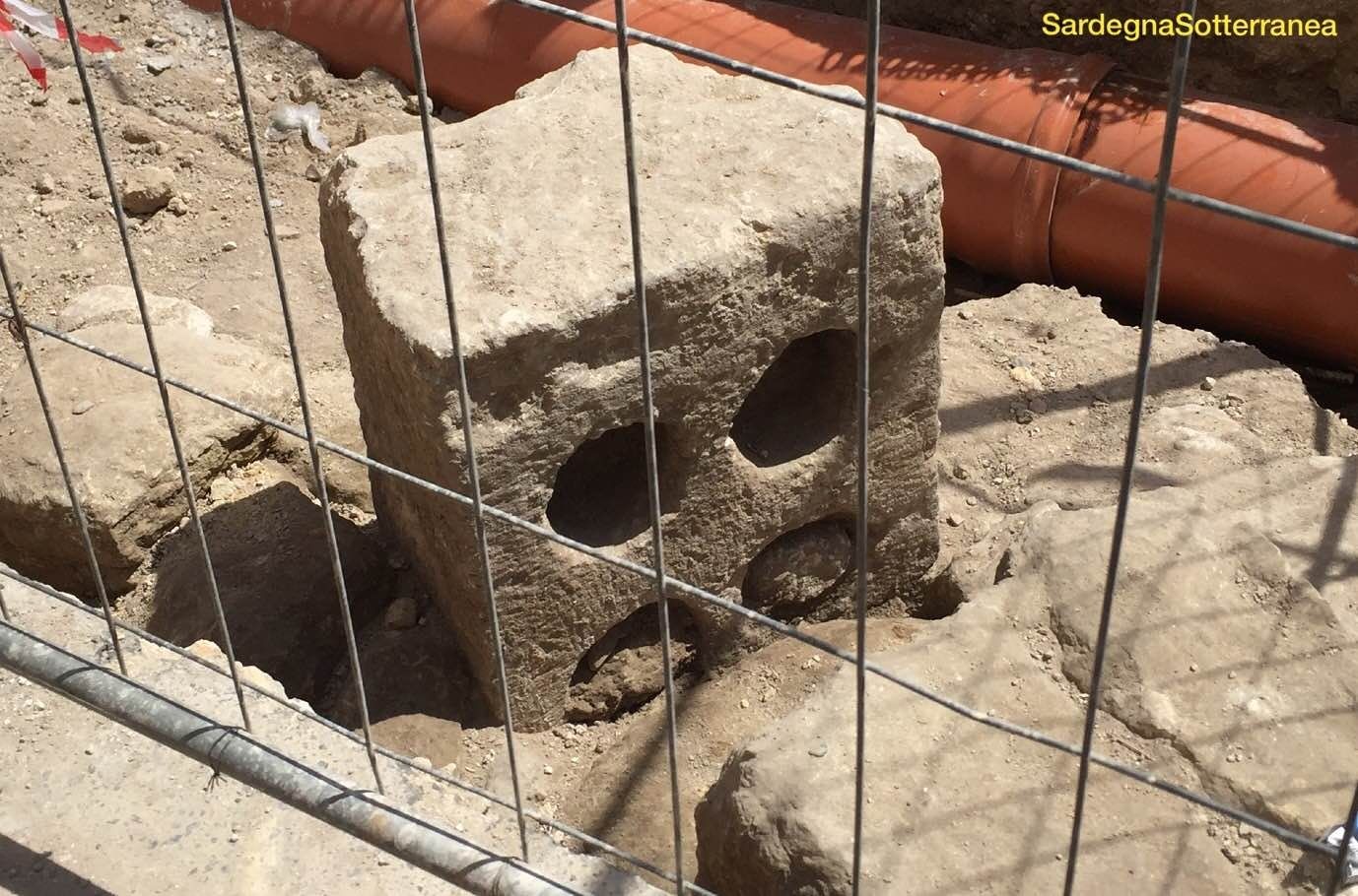 L’altro ieri, stessa località, nuova scoperta: durante la realizzazione dei sottoservizi è riaffiorato un altro reperto, anzi due, o meglio molti di più… Fanno bella mostra in una trincea a cielo aperto, accanto alle reti metalliche protettive, sul ciglio estremo della piazza, tra l’edicola dei giornali e l’adiacente via Iglesias.