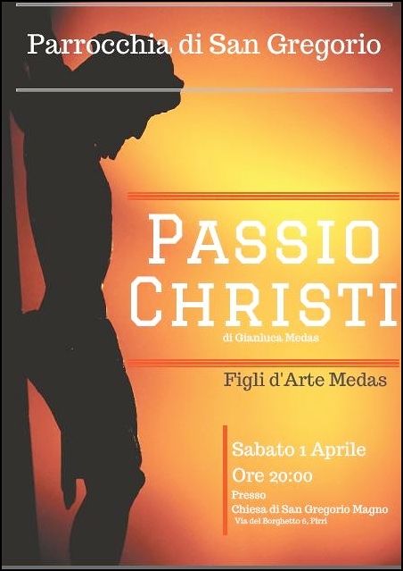 Passio Christi è il monologo di Gianluca Medas che ripercorre le tappe della Passione di Gesù, dalla cena alla crocifissione. Lo spettacolo attraversa il percorso che porta Gesù dal calore della famiglia alla violenza della sua crocifissione e lo fa attraverso uno sguardo umano, intimo.