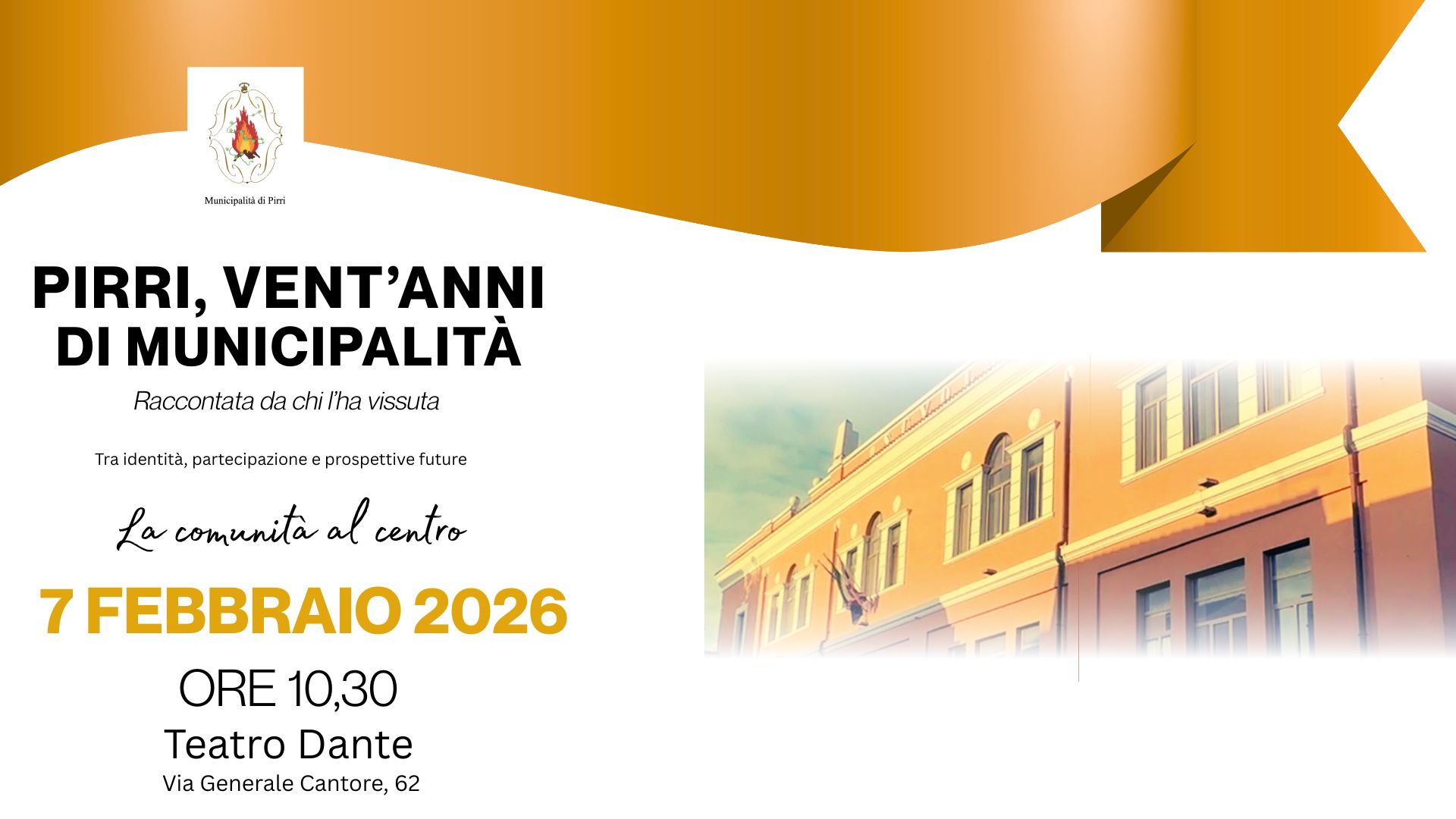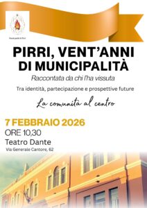 Il 2026 segna un traguardo storico per Pirri: il 7 febbraio ricorrono i vent’anni dall’istituzione della Municipalità, sancita dallo Statuto del Comune di Cagliari. Un anniversario, che sarà celebrato al Teatro Dante, in via Generale Cantore. Il convegno, con inizio a partire dalle ore 10,00, vedrà partecipare i protagonisti che hanno contribuito, con la deliberazione n. 16 del 2006, all’introduzione per la prima volta in Sardegna di un modello di decentramento amministrativo guidato da un proprio Consiglio e da un Presidente (carica ricoperta all’esordio da Antonio Melis).