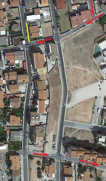 Nella foto, con le frecce rosse ho indicato i nuovi sensi unici; la linea gialla indica la presenza del divieto di sosta.