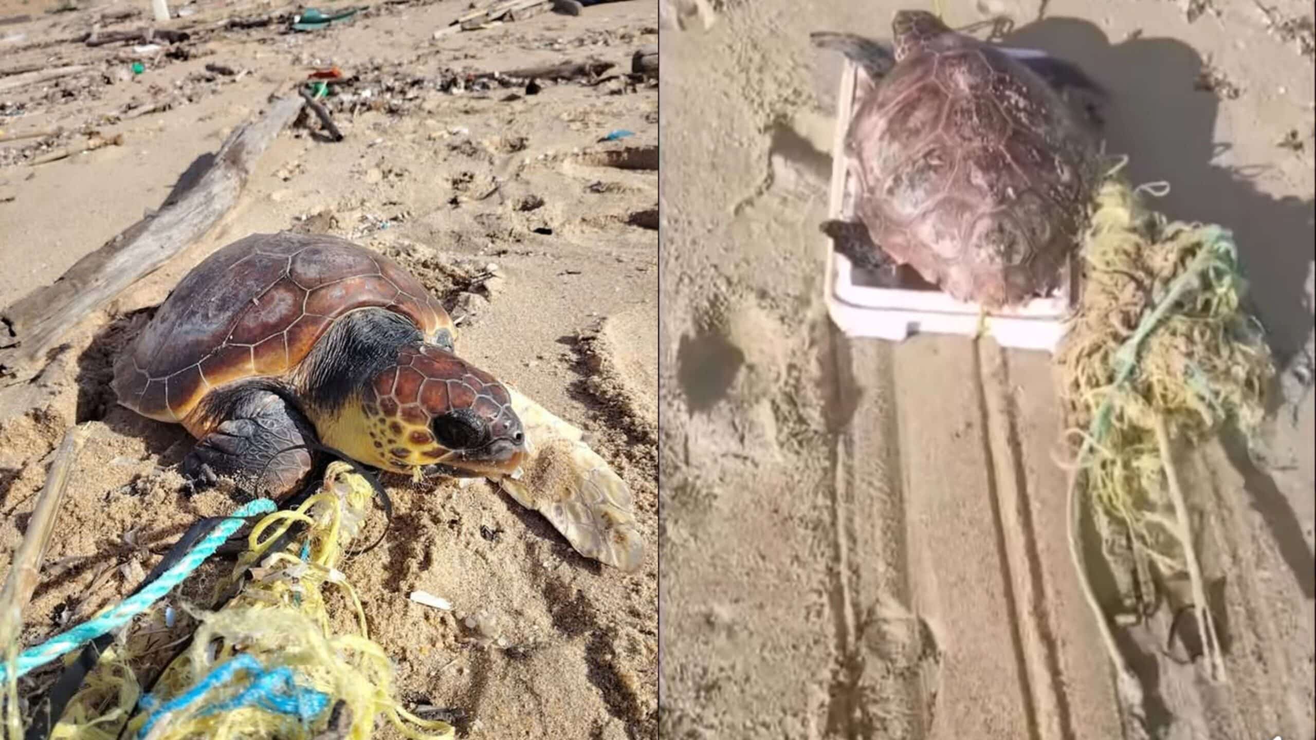 Una povera tartaruga avvolta tra funi di ogni genere.