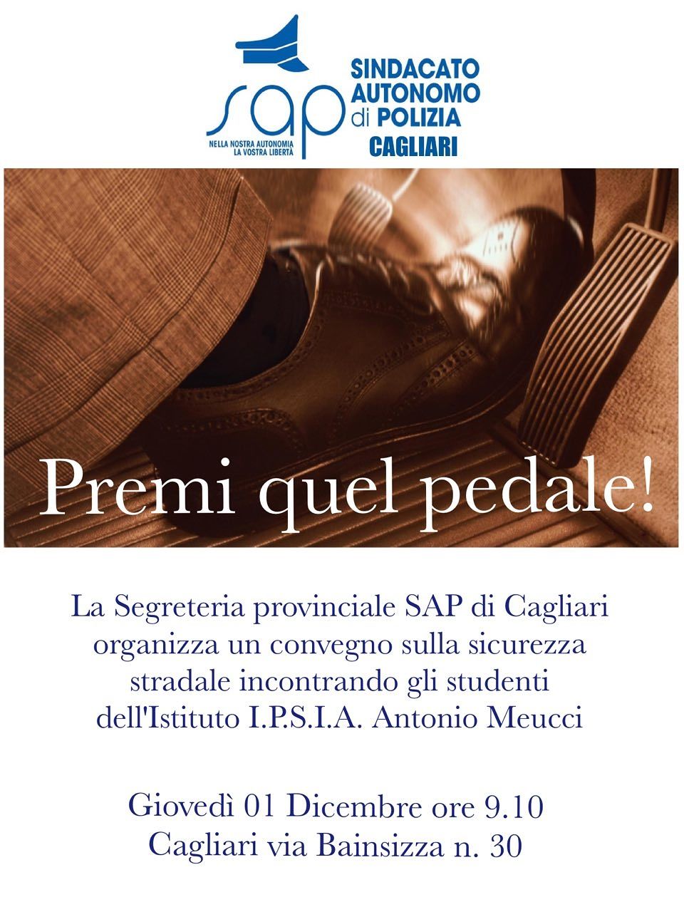 I poliziotti salgono in cattedra. Il Sindacato Autonomo di Polizia di Cagliari ha organizzato un convegno all’Istituto I.P.S.I.A “Antonio Meucci” di Cagliari per domani, giovedì 1° dicembre 2016 dalle ore 9. Verranno svolti tre incontri durante i quali si alterneranno tutti gli studenti appartenenti alle terze, quarte e quinte classi. Il progetto, denominato “Schiaccia quel Pedale”, vuole sensibilizzare chi è appena diventato o lo diventerà a breve un utente della strada, alla luce dei tragici fatti di sangue che inesorabilmente macchiano le strade cagliaritane.