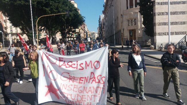 Nicola Giua dei Cobas è furioso: “Senza green pass molti colleghi o faranno i tamponi a pagamento o non potranno lavorare. Il ministro dell’Istruzione, Bianchi, continua a dire che va tutto bene, ma nelle scuole continuiamo ad avere troppi prof precari e non viene garantita la giusta sicurezza. Basta pensare al metro di distanza da rispettare”, attacca Giua. “Non è obbligatorio, viene chiaramente detto che va rispettato solo se è possibile”. Presenti anche gli studenti del Fronte della gioventù comunista: “Le scuole cadono a pezzi, si tutelano solo gli interessi capitalistici dei padroni”. Molti i cartelli “contro il green pass e il fascismo”, in quest’ultimo caso è chiaro il riferimento ai fatti avvenuti a Roma lo scorso weekend, quando un gruppo di estremisti ha assaltato la sede della Cgil.