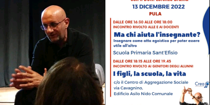 Due incontri con Lorenzo Braina per parlare e confrontarsi con insegnanti, genitori e alunni sulle tematiche riguardanti l’educazione e il comportamento più opportuno da adottare per riconoscere e intervenire su disagi, manifestazioni, atteggiamenti e modi di agire dei ragazzi. L’assessorato alle Politiche ha organizzato per la giornata di domani due nuovi appuntamenti con l’apprezzatissimo educatore e divulgatore pedagogico, Lorenzo Braina: il primo appuntamento, dal titolo “Ma chi aiuta l’insegnante?”, è rivolto ai docenti e si svolgerà dalle ore 16:30 alle ore 18:00 presso la Scuola Primaria Sant’Efisio.