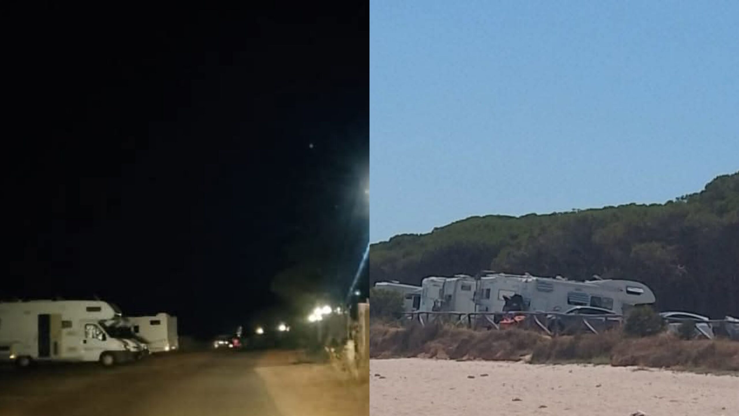 Tanti camper parcheggiati sia di giorno che durante la notte nelle aree adiacenti alla spiaggia.