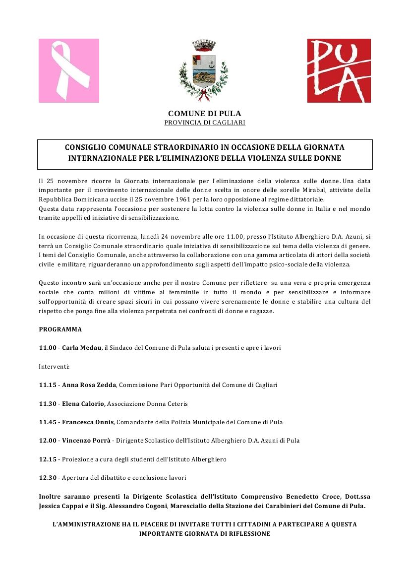 Un consiglio comunale straordinario contro la violenza sulle donne. “La politica che si avvicina ai giovani, per un messaggio che vuole essere soprattutto di speranza”. Così il sindaco Carla Medau presenta l’appuntamento di lunedì prossimo alle 11 presso l’Istituto Alberghiero. Per una volta l’intero consiglio comunale di Pula si riunisce in una scuola, in quello che sarà un appuntamento davvero originale. Le forze politiche di maggioranza e opposizione lanceranno così un segnale forte contro la violenza sulle donne, Pula inaugurerà in questo modo una settimana densa di appuntamenti sul tema nel Cagliaritano. “Vogliamo che l’Amministrazione comunale sia vicina ai cittadini su temi così importanti e delicati- spiega il sindaco- e per questo abbiamo scelto l’Alberghiero: è lì, davanti ai ragazzi che studiano a Pula, che vogliamo dare il nostro contributo contro la violenza sulle donne. Troppe volte le sedute si svolgono in luoghi istituzionali difficili da raggiungere per i ragazzi, questa volta saremo noi ad andare da loro. Per un tema che ci sta particolarmente a cuore”. Tutta la popolazione di Pula è dunque invitata a partecipare. I temi del Consiglio Comunale, anche attraverso la collaborazione con una gamma articolata di attori della società civile e militare, riguarderanno un approfondimento sugli aspetti dell’impatto psico-sociale della violenza. “Questo incontro sarà un’occasione anche per il nostro Comune per riflettere su una vera e propria emergenza sociale che conta milioni di vittime al femminile in tutto il mondo e per sensibilizzare e informare sull’opportunità di creare spazi sicuri in cui possano vivere serenamente le donne e stabilire una cultura del rispetto che ponga fine alla violenza perpetrata nei confronti di donne e ragazze”, spiega il sindaco.
