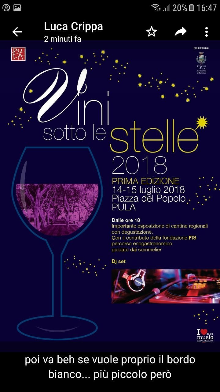 Il tutto realizzato in collaborazione con l’assessorato al Turismo del comune di Pula, per animare la Piazza della bellissima città di Pula e permettere alle persone, oltre alla bellissima passeggiata per gli acquisti nella via dello shopping ,anche di potersi trattenere nella bellissima piazza e poter degustare i vini provenienti da tutta la Sardegna accompagnati dalla musica dei dj set.