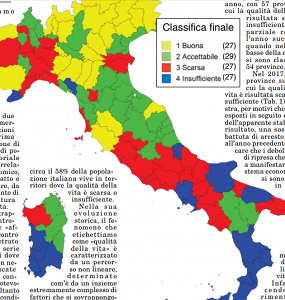 Prima in classifica si conferma anche quest’anno Bolzano, seguita da Trento e Belluno. Per rivedere le province sarde bisogna scendere al 47^ posto con Nuoro e al 48^ con l’Ogliastra. Notizia positiva perché sono le uniche che risalgono addirittura di 10 punti, lo scorso anno erano rispettivamente al 58^ e 57^. Olbia- Tempio risale al 52^ posto (dal 54^ dell’anno scorso). Sassari perde 7 punti e si piazza al 79^.