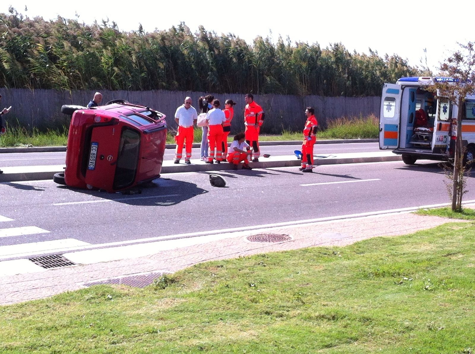 L’Opel Agila si ribalta completamente sull’asfalto, il conducente resta ferito e viene subito soccorso dai medici dell’ambulanza del 118. Il rocambolesco incidente è avvenuto intorno alle 14, nella zona di Quartello. La Opel ha centrato in pieno un palo, poteva essere una tragedia ma fortunatamente l’uomo rimasto ferito non è in gravi condizioni. Nella foto scattata dal nostro Filippo Pau, potete vedere i primi soccorsi subito dopo l’incidente, dovuto forse ad una distrazione.