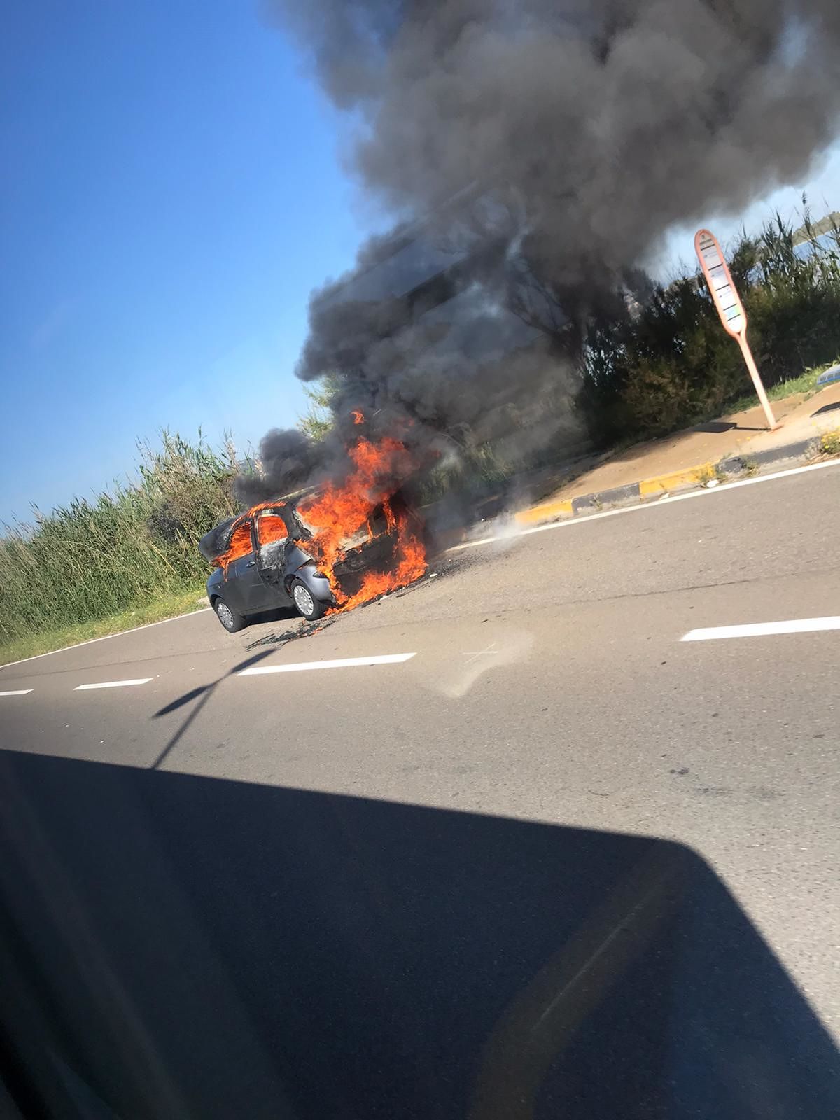 Automobile in fiamme nel tratto quartese del lungomare Poetto, di fronte allo stabilimento dei carabinieri. Il fatto è successo verso le nove e mezzo del mattino.