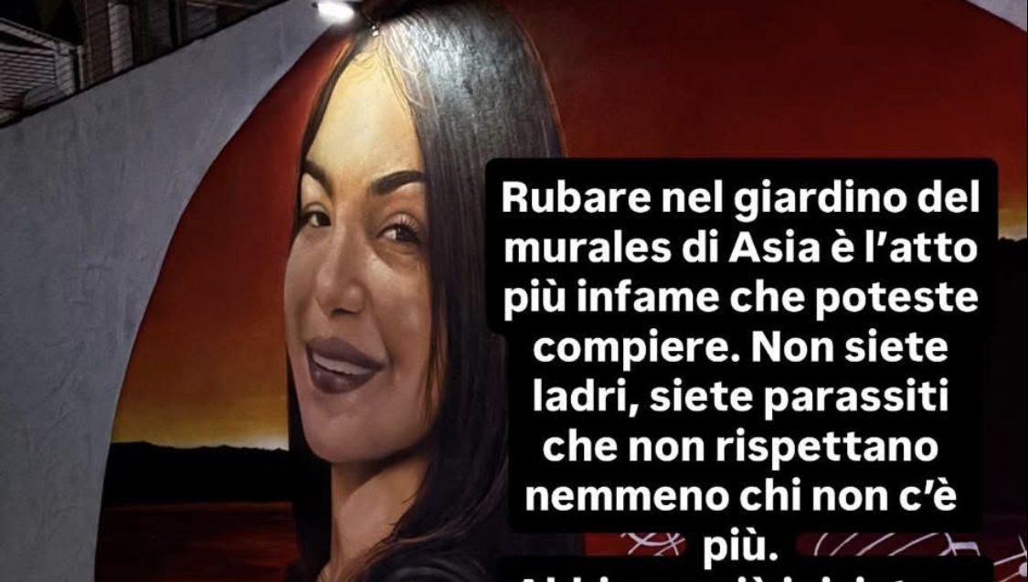 “Rubare nel giardino del murales dedicato ad Asia è l’atto più infame che poteste compiere”, si legge nel post. “Non siete ladri, siete parassiti che non rispettano nemmeno chi non c’è più. Abbiamo iniziato iniziato a controllare le telecamere della zona e a chiedere in giro. Sappiamo che qualcuno ha visto. Vi diamo una sola possibilità per ripulirvi la coscienza (se ne avete una) riportate tutto lì entro domani mattina. Se non lo fate faremo di tutto per trovarvi e assicurarci che in tutto il quartiere si sappia che facce da schifo avete”.