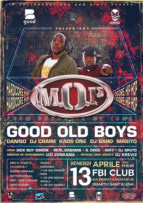 Per il concerto degli M.O.P la B-good collabora insieme ad altre due realtà di punta nel panorama hip hop sardo (e non solo), già organizzatrici della data degli ONYX a Cagliari nell’Ottobre dell’anno scorso. Da una parte i Dirty Dagoes, collettivo di produzione e di organizzazione eventi, dei quali Simone Lumini (aka Sick Boy Simon), ha svolto per l’evento il ruolo di tour manager della band americana. Dall’altra la Butterfly Skull, una vera e propria family che ha deciso di fondare nel 2012 un brand di abbigliamento di qualità, attento all’estetica e al design street.