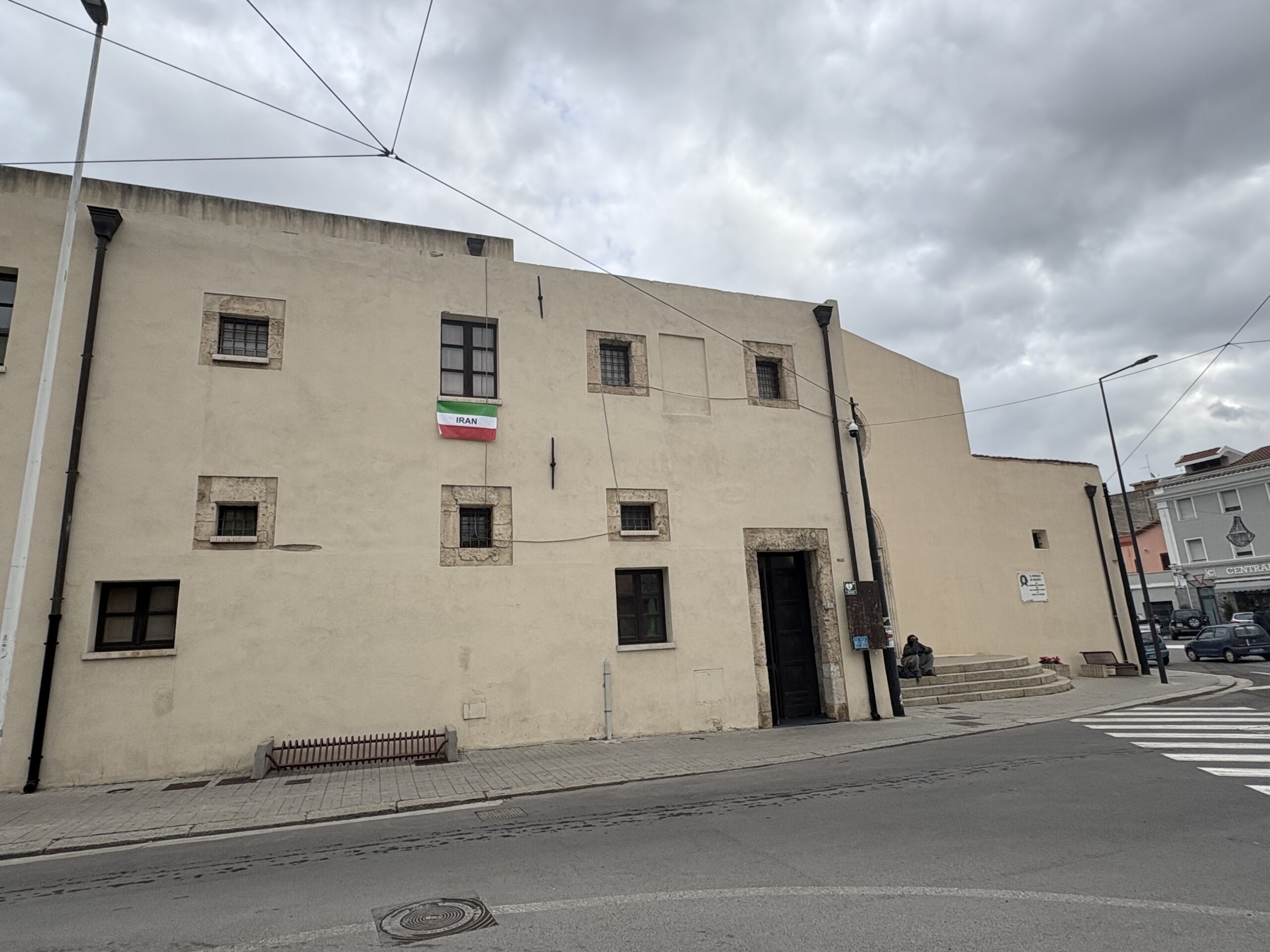 Lo stendardo esposto nella facciata dello storico edificio di via Brigata Sassari, sede istituzionale del sindaco Graziano Milia, è la variante non ufficiale della bandiera iraniana utilizzata da diversi manifestanti, con le tre bande orizzontali verde, bianco e rosso e la scritta ‘Iran’ al centro. Il vessillo esprime distacco sia dal passato monarchico dello Scià (stesse bande e stessi colori ma al posto della scritta un’immagine del leone e del sole) sia dal presente teocratico (stesse bande e stessi colori ma al posto della scritta l’emblema di Allah stilizzato), proponendo così un’identità iraniana neutra, laica e unitaria.