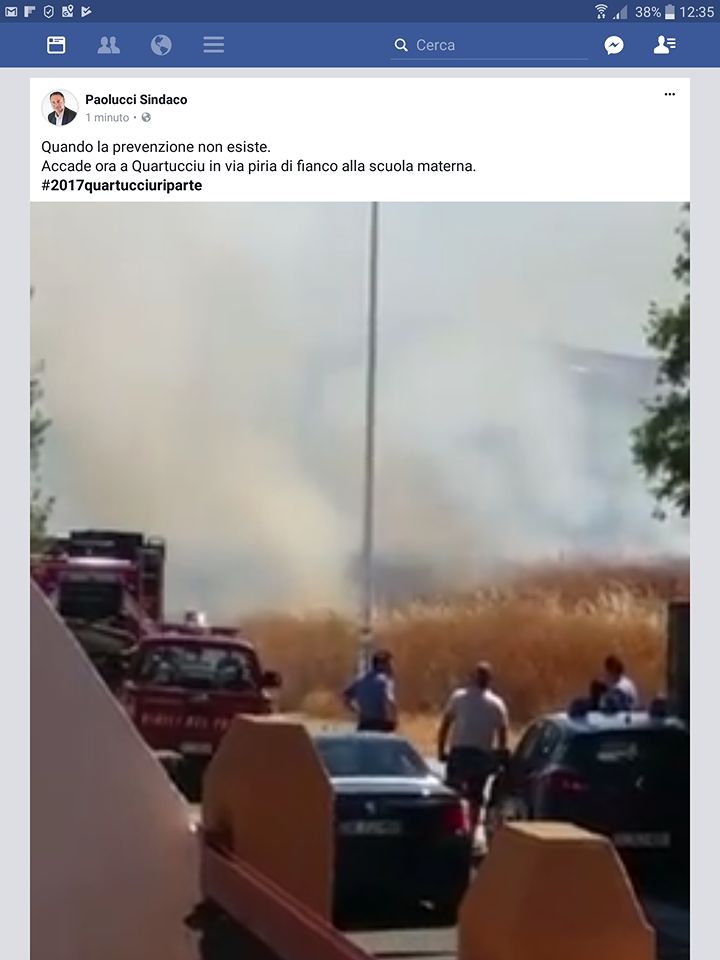 Fuoco e polemiche a Quartucciu. Le fiamme a due passi da una scuola. La notizia è stata data sul suo profilo Fb dal candidato sindaco Damiano Paolucci, che ha pubblicato anche il video dell’incendio in corso: “Quando la prevenzione è fondamentale per non mettere a rischio l’incolumitá dei cittadini. Accade ora a Quartucciu lottizzazione Sarritzu, via Piria angolo via Oliena di fianco alla scuola materna”. Nella foto il post di Paolucci.