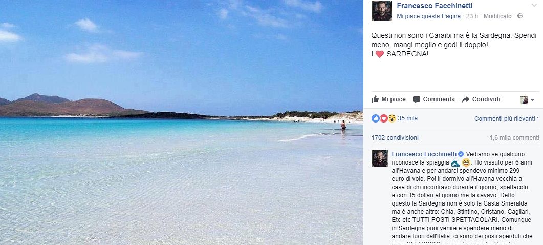 Lo spot del cantante Francesco Facchinetti per la Sardegna dal suo profilo Facebook colleziona migliaia di mi piace e diventa virale. Con la foto di una bellissima spiaggia dell’Isola, acqua turchese, sabbia bianca finissima corredata dalla didascalia-spot “Questi non sono i Caraibi, ma la Sardegna. Spendi meno, mangi meglio e godi il doppio”. E ancora nei commenti la Sardegna non è solo la costa Smeralda ma anche altro: Chia, Stintino, Oristano, Cagliari etc. etc. TUTTI POSTI SPETTACOLARI”.