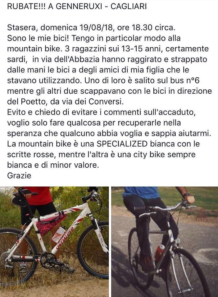 Con un post su Fb scritto da Alessio Sanna, padre di un’amica dei ragazzi derubati che sta diventando virale: “Stasera intorno alle 18,30- si legge nel post- sono state rubate le mie bici, tengo in particolare alla mountain bike. Tre ragazzini tra i 13 e i 15 anni, certamente sardi, in via dell’Abbazia hanno raggirato e strappato dalle mani le bici a degli amici di mia figlia che le stavano utilizzando. Uno di loro è poi salito sul bus nuimero 6 del Ctm, mentre gli altri due scappavano con le bici in direzione Poetto, via dei Conversi. Evito e chiedo di evitare i commenti sull’accaduto, voglio solo fare qualcosa nella speranza che qualcuno possa aiutarmi. la mountain bike è una SPECIALIZED bianca, con le scritte rosse, mentre l’altra è una City Bike sempre bianca e di minor valore”.