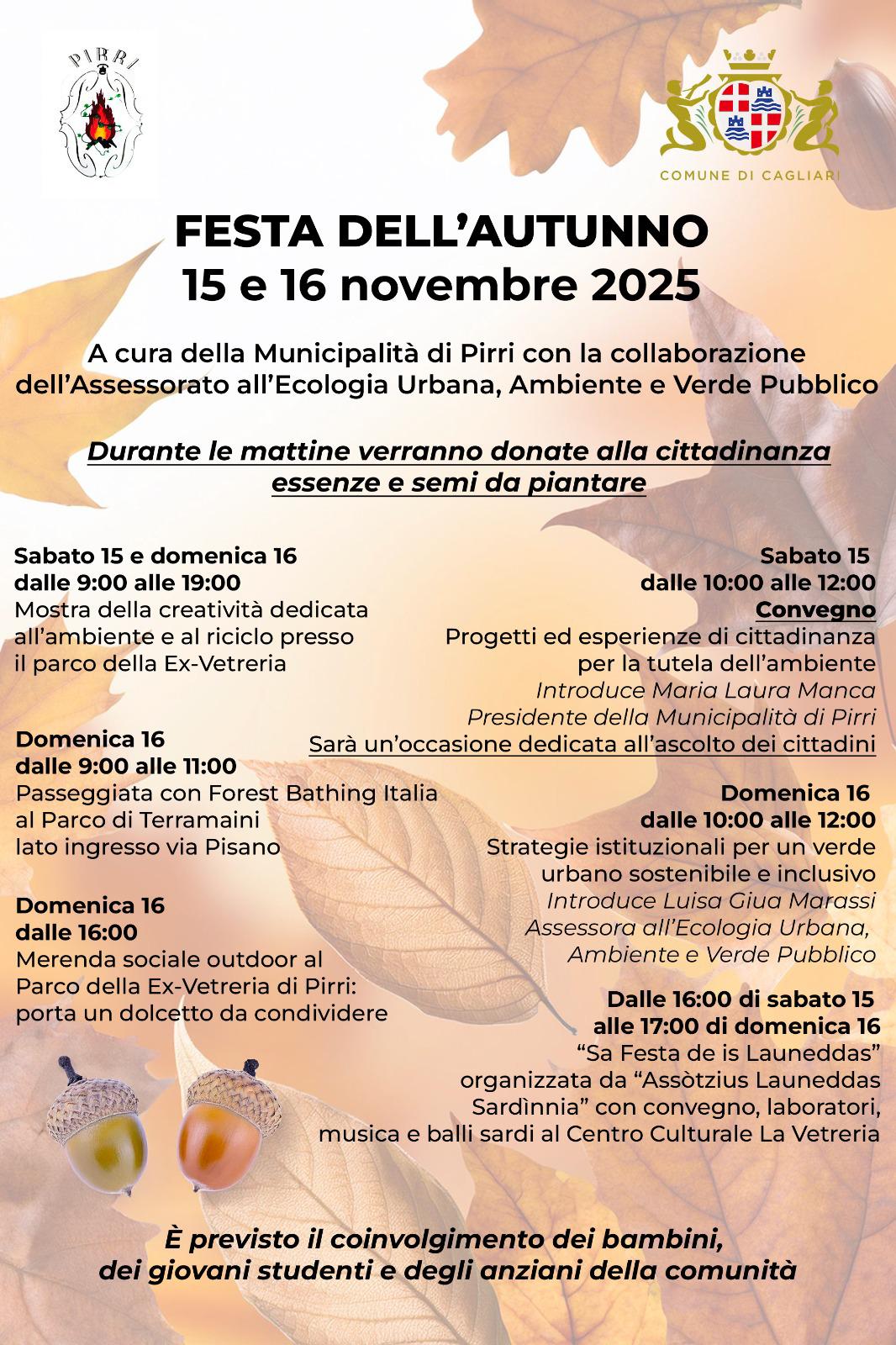 La Municipalità di Pirri organizza la “Festa dell’autunno”, dal 15 al 16 novembre 2025, presso il parco della Ex Vetreria di Pirri. L’evento si inserisce all’interno del programma della “Settimana del Verde e dell’Ambiente” organizzata dall’assessorato all’Ecologia urbana, ambiente e verde pubblico del Comune di Cagliari.